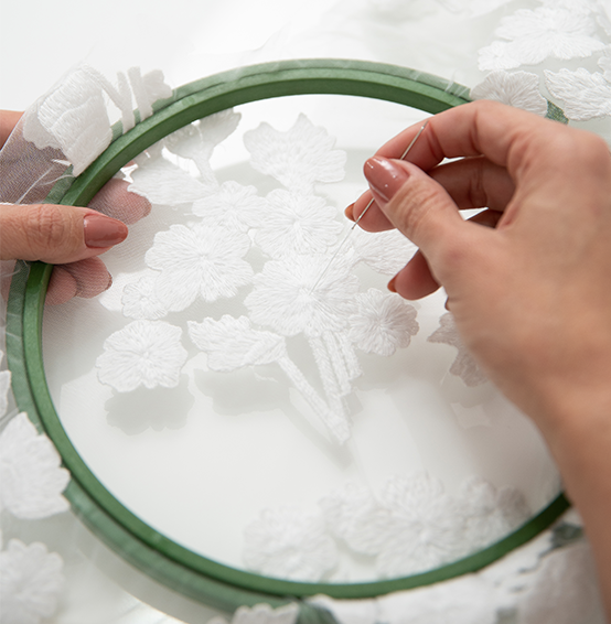 Mesmo com o suporte de alta tecnologia, o trabalho manual é protagonista em nossas etapas de desenvolvimento e produção. Um bordado Marie Mercié recebe, no mínimo, o cuidado de 7 processos manuais até ser totalmente finalizado.